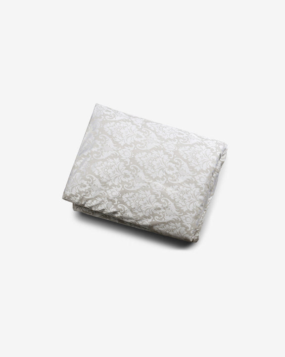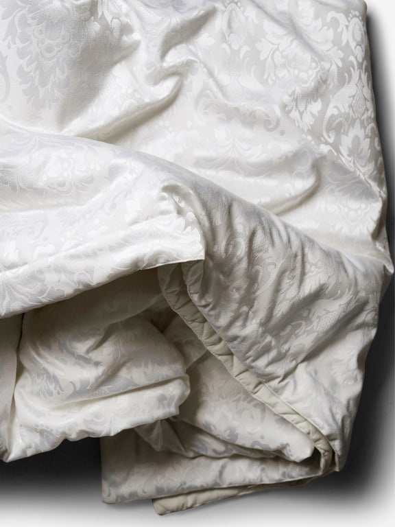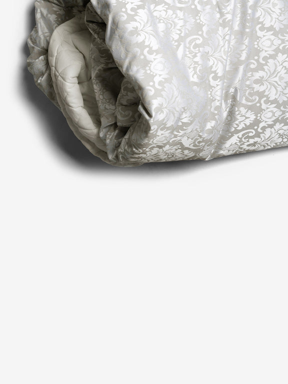 An elegant ivory bedcover adorned with finely detailed jacquard motifs,offering a harmonious blend of comfort and understated luxury.perfect for creating a serene,thoughtfully styled bedroom.