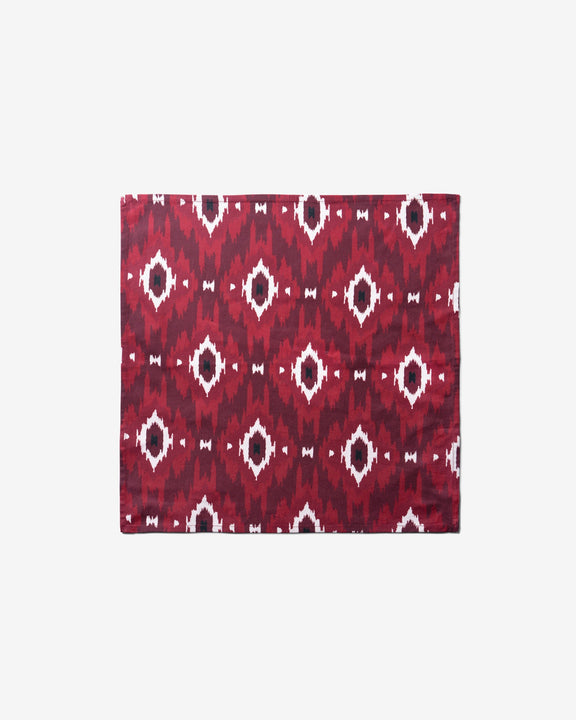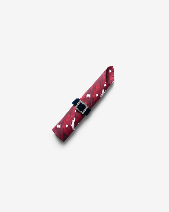 Set on a rich maroon base, intricate white and deep-toned motifs create a striking, artful Ikat-inspired look. Versatile and full of cultural flair, it instantly elevates your table—paired with a blue velvet napkin ring, finished with a studded motif brooch for a refined accent.